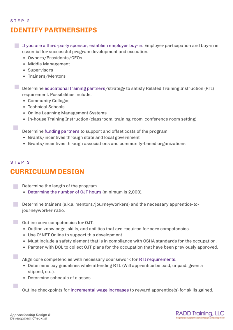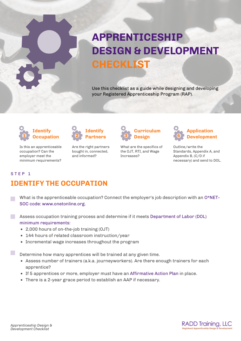 This three-page checklist is designed for employers and third parties interested in creating Registered Apprenticeship Programs. It is the approach we use at RADD Training when we work with the Department of Labor.