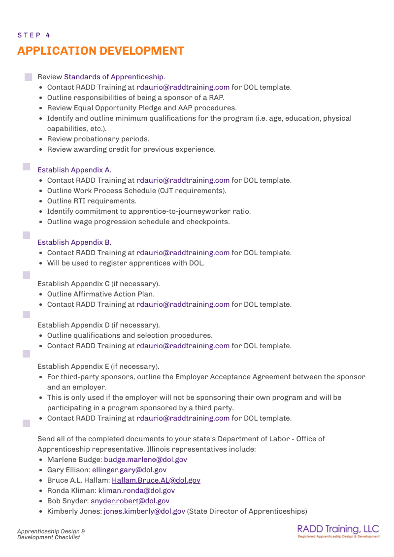 If you have questions, please contact us at rdaurio@raddtraining.com. We are happy to support you in developing your Registered Apprenticeship Programs. After all, we are the pros!